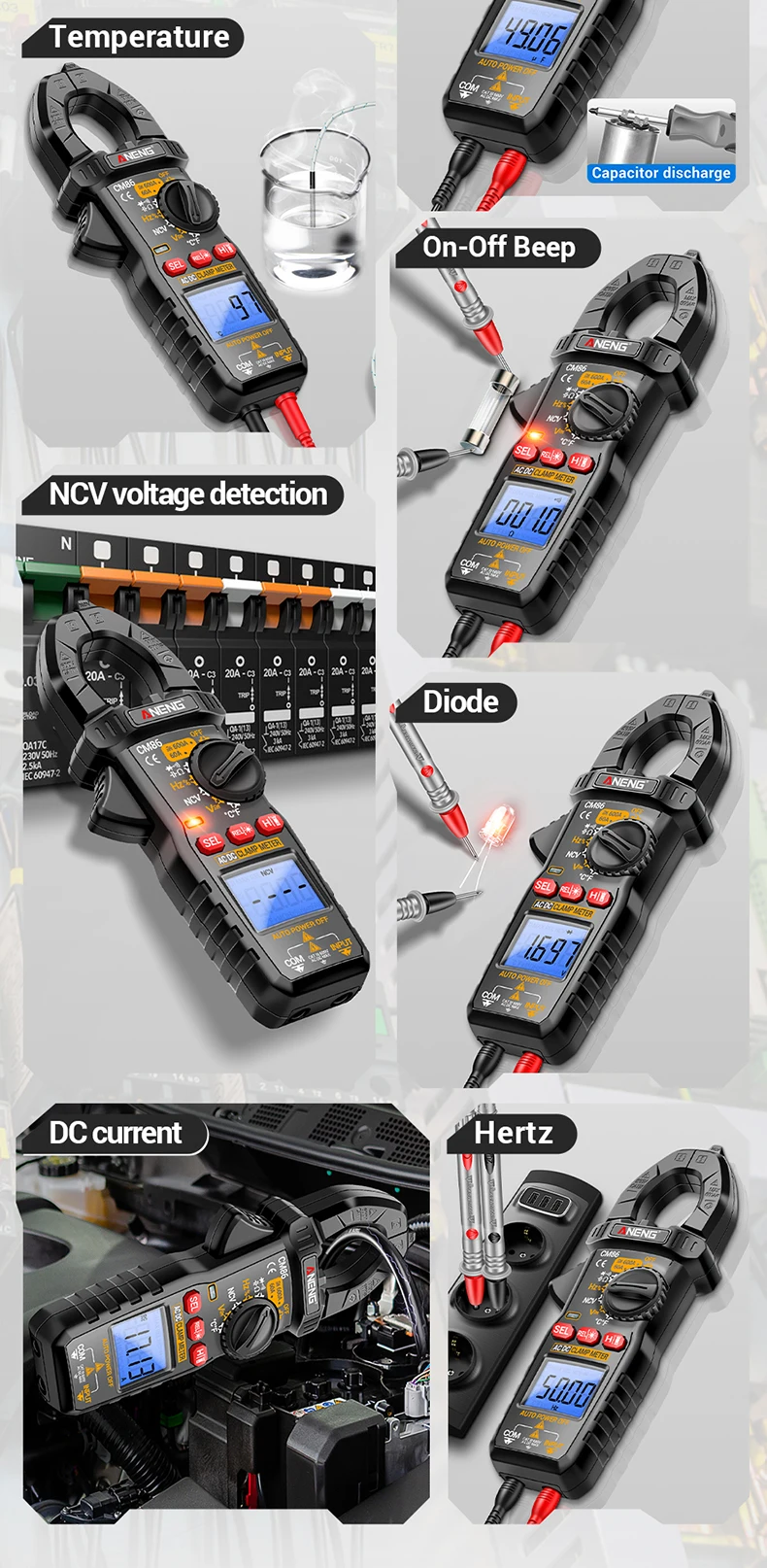 A multímetro digital Aoneng CM86 com pino de amperímetro de mordaza de 600A para corrente alternada/CC, tensão, diodo e detecção de tensão NCV é uma ferramenta profissional para eletricistas.