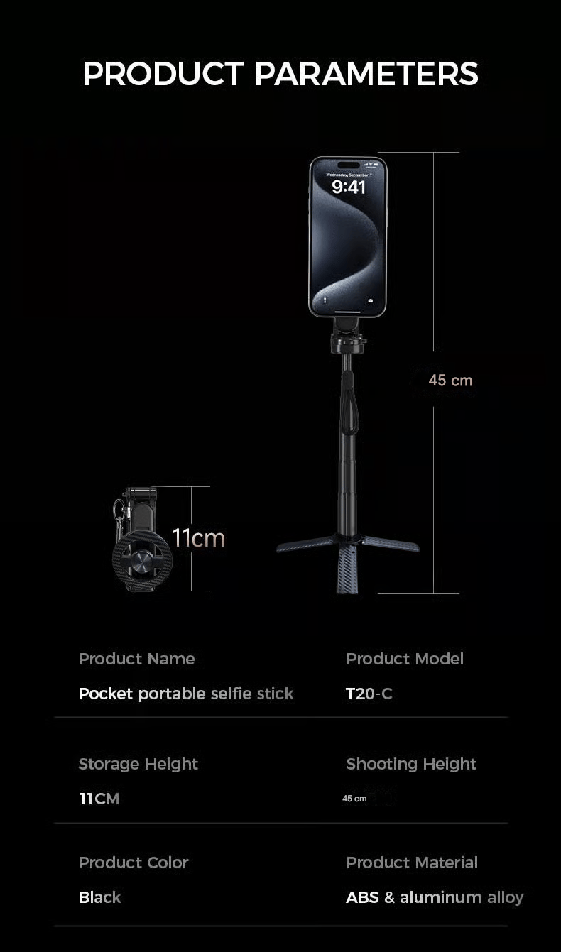 . Ao contrário dos bastões de selfie comuns, ele possui um suporte de baioneta inteligente para facilitar o armazenamento e o acesso ao controle remoto. O disparador sem fio funciona a até 10 metros de distância , para que você possa tirar fotos perfeitas sozinho com apenas um clique! 📷✨