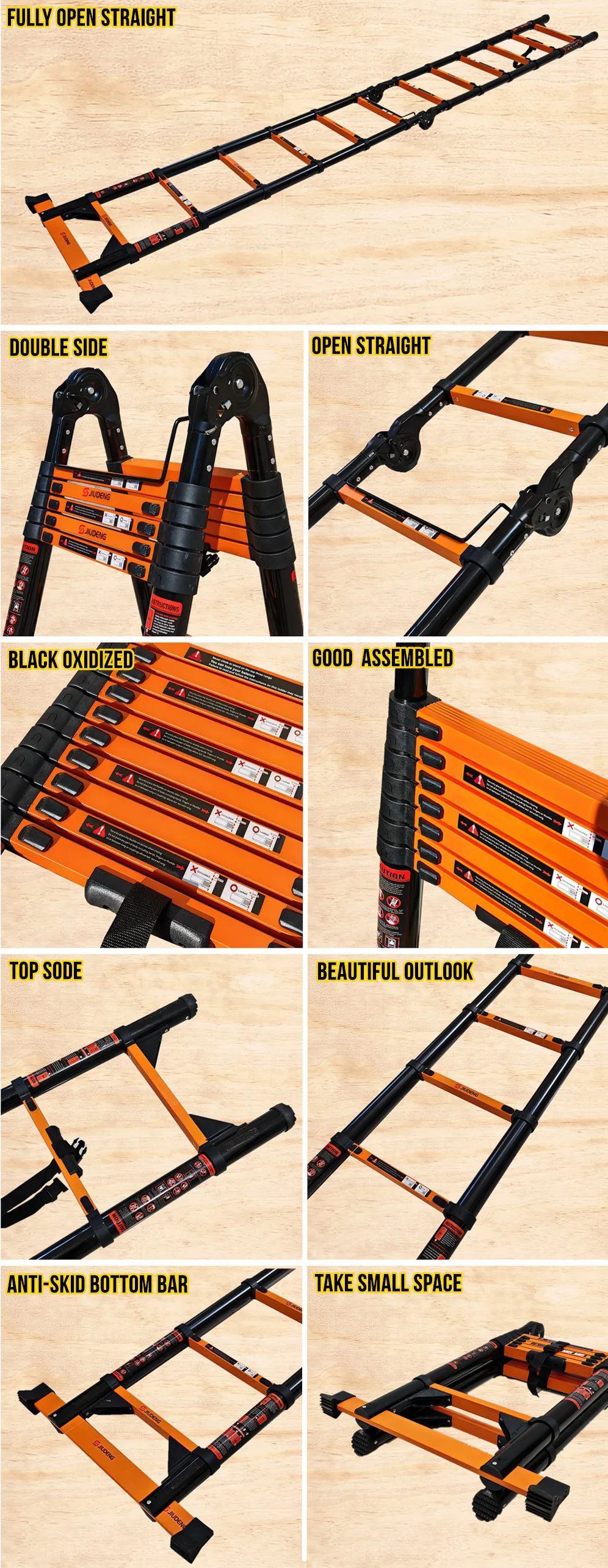 Esta escada telescópica multifuncional de aço é feita de aço carbono de alta resistênciaSua superfície é o tratamento de oxidação preta, boa aparência e, entretanto, anti-rust.very adequada para uso doméstico diário.